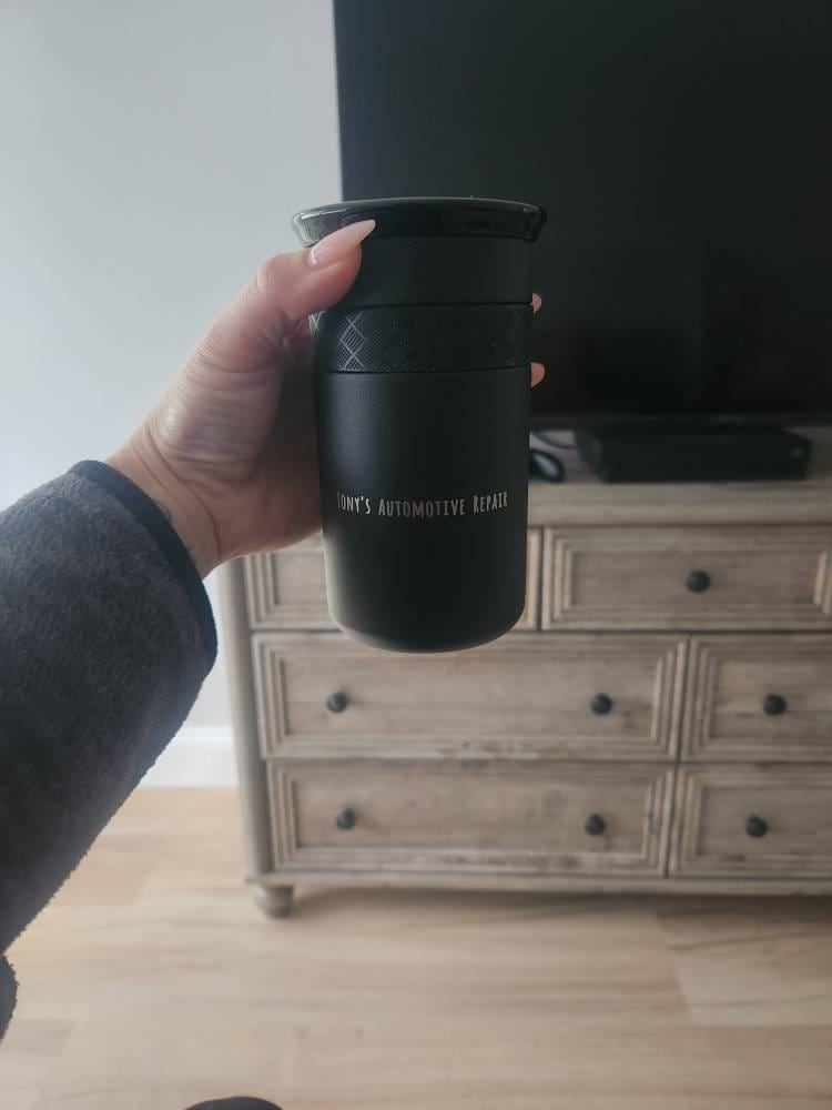 This listing is for personalizing by laser engraving a name or text on 100% authentic Elemental coffee tumblers that come in 12oz and 16oz size. The text engraving is permanent and will show a glossy silver finish of the stainless steel.